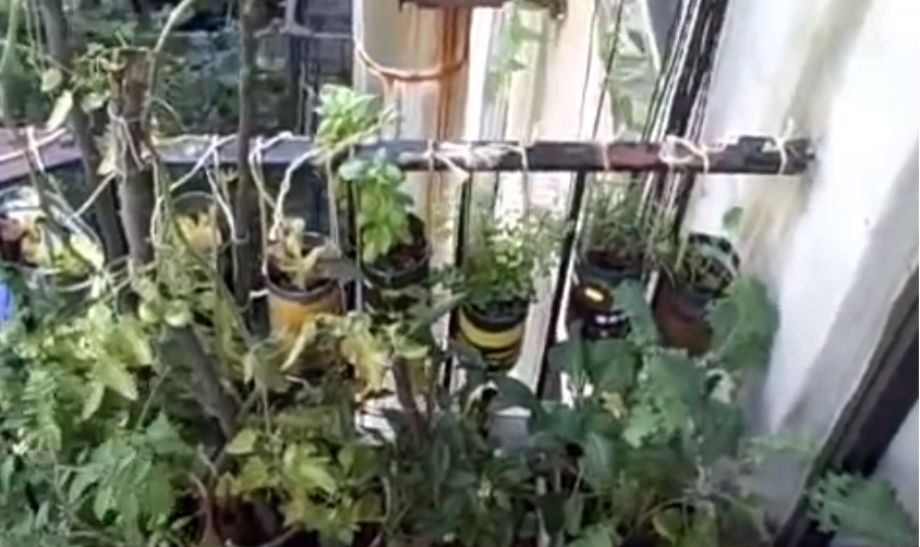 The landing space of the fire escape was about 2 x 3. There were three self-watering containers that were planted up against the rail. This left over a foot of space on the landing.